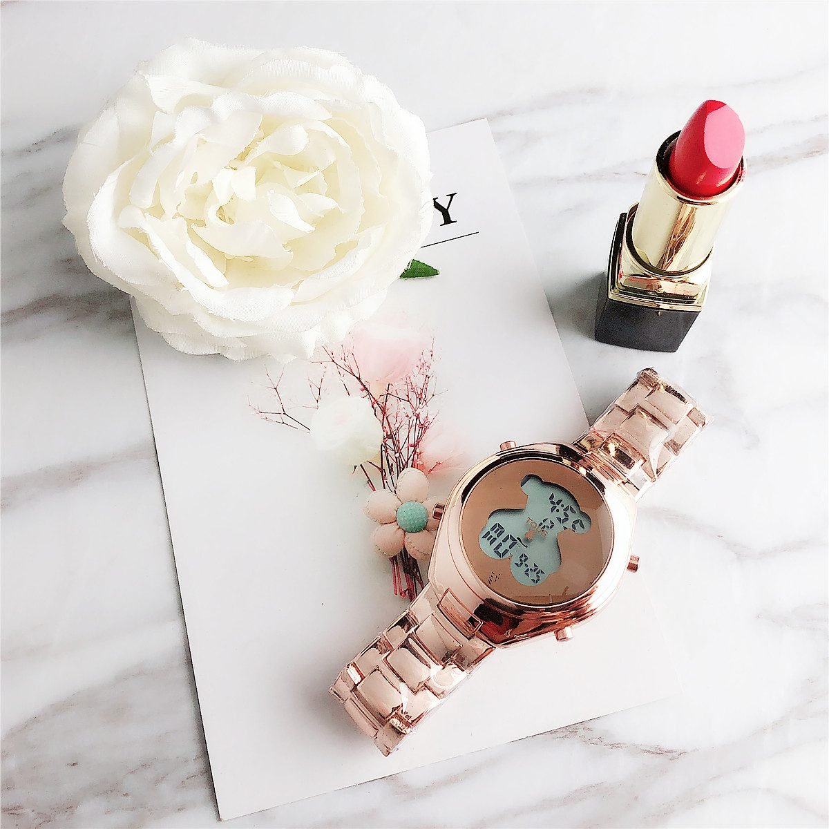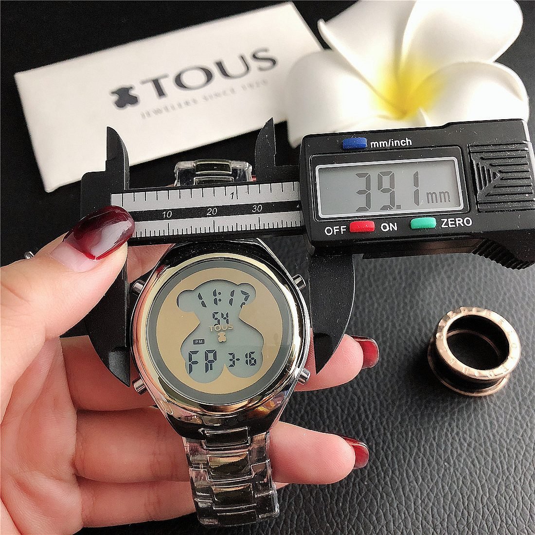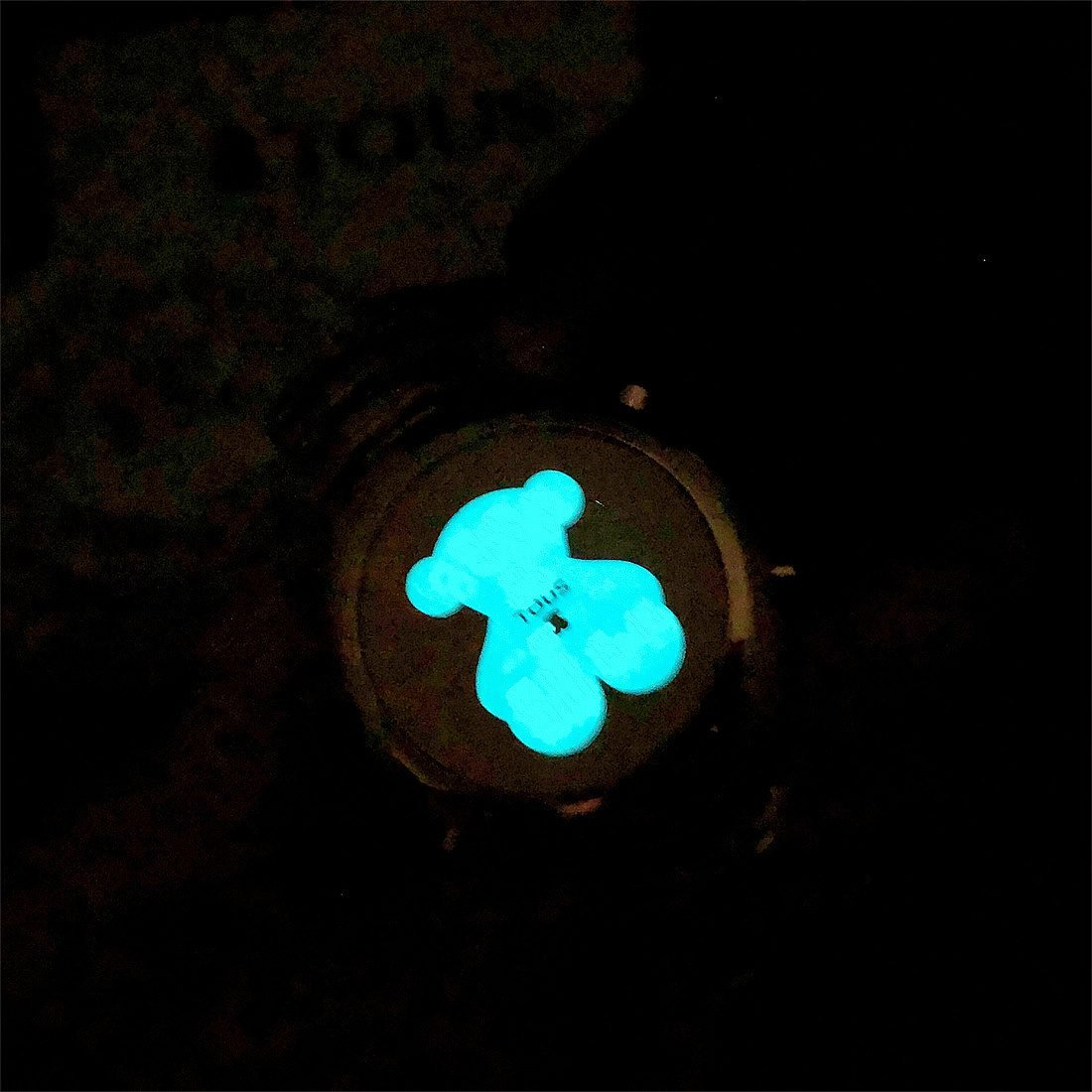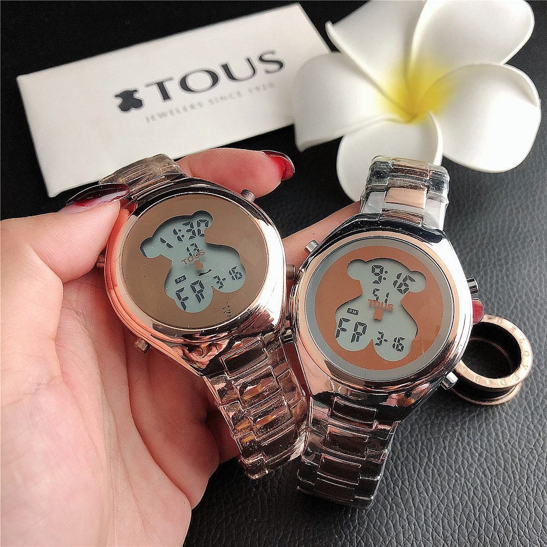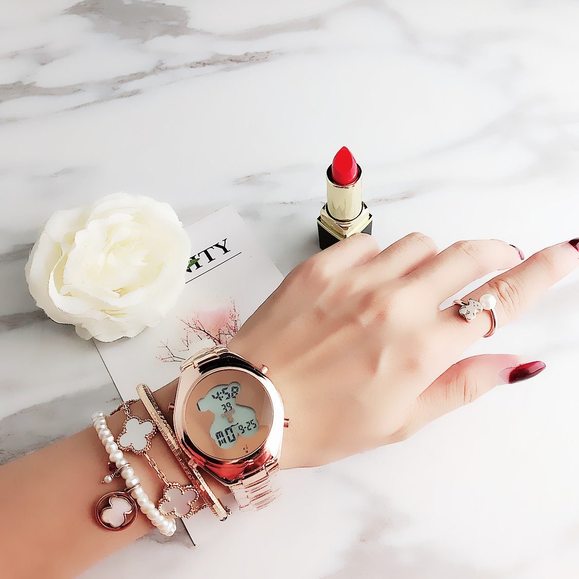 The central position is printed with a peach bear pattern, which is the logo of the TOUS brand, adding unique personality and recognition to the watch.