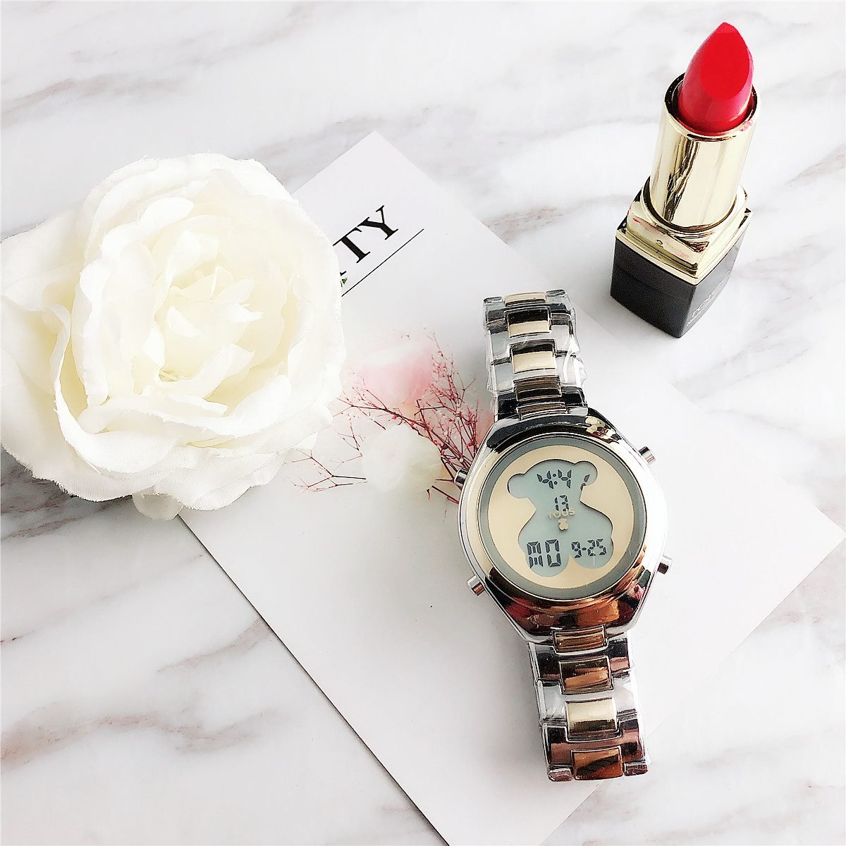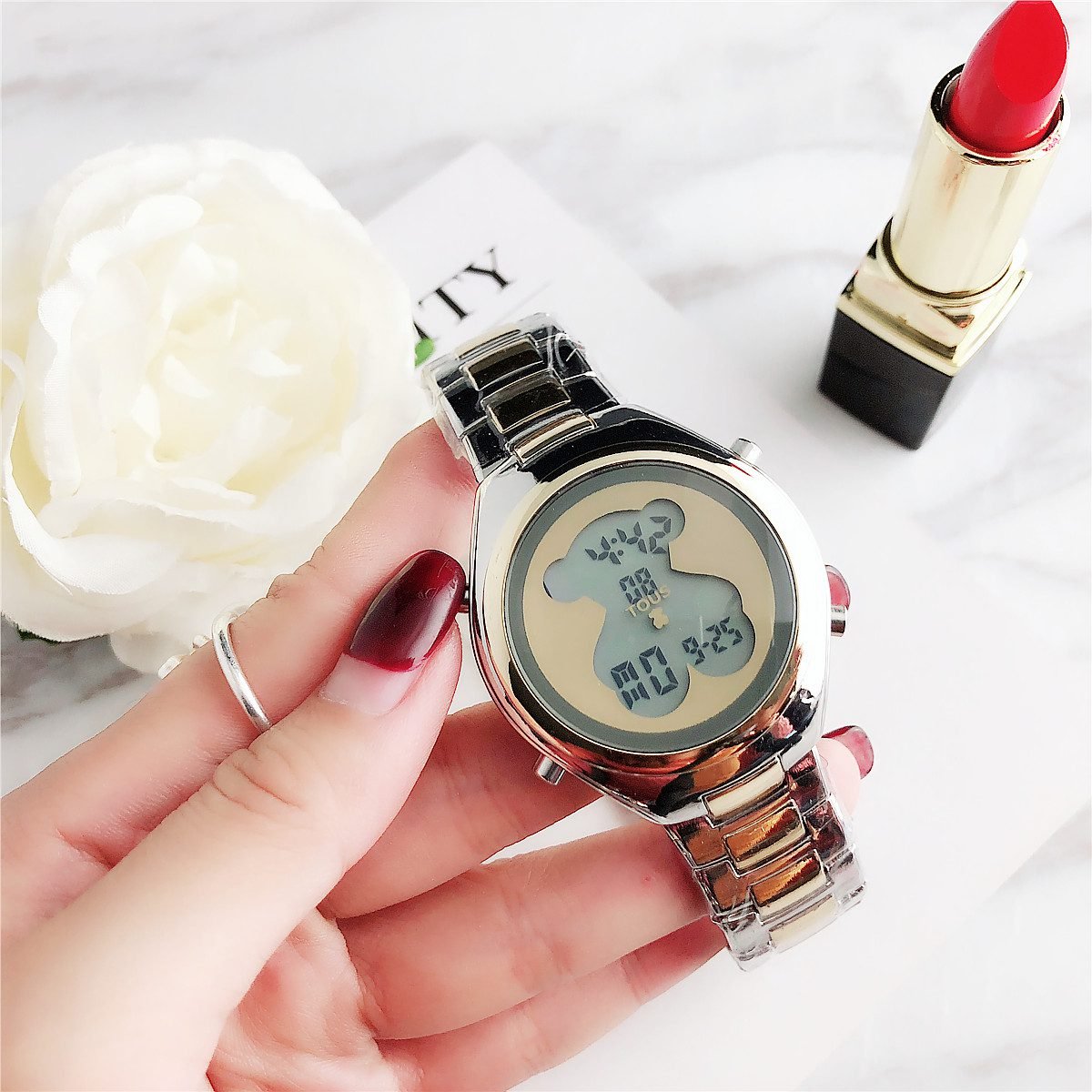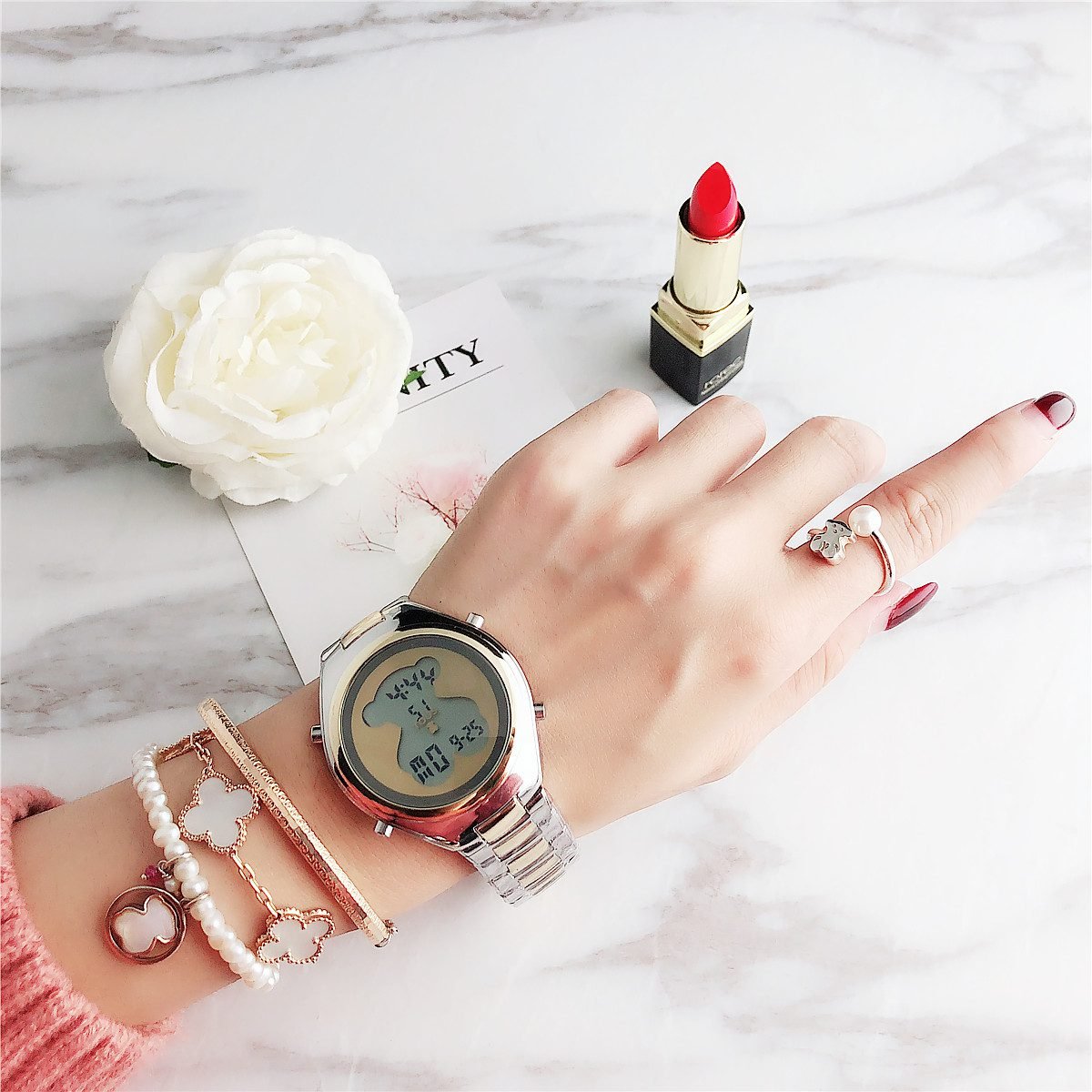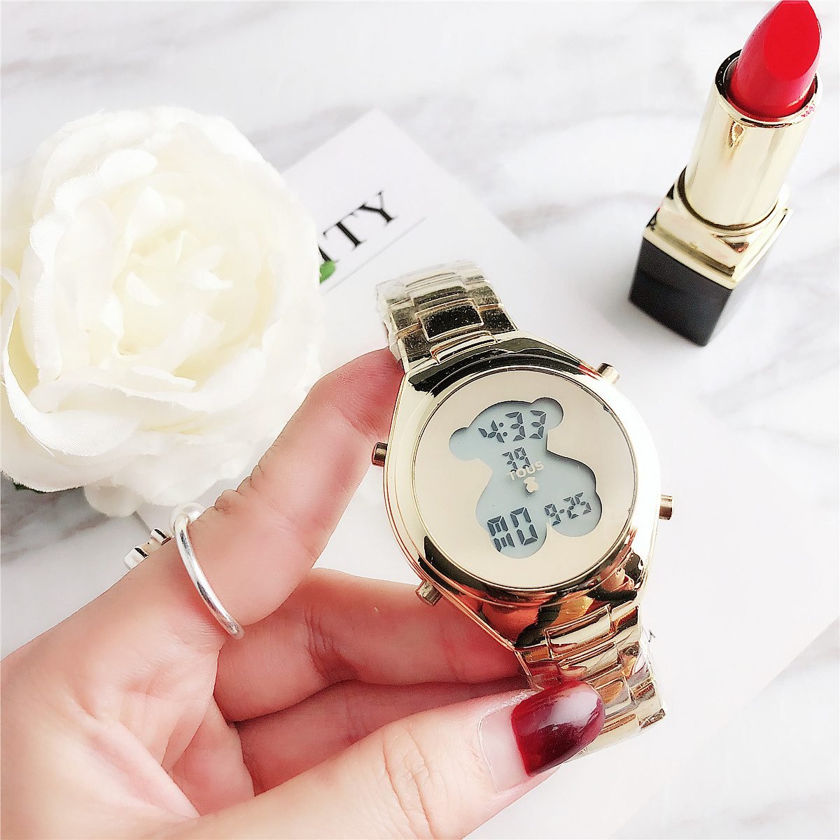 The central position is printed with a peach bear pattern, which is the logo of the TOUS brand, adding unique personality and recognition to the watch.