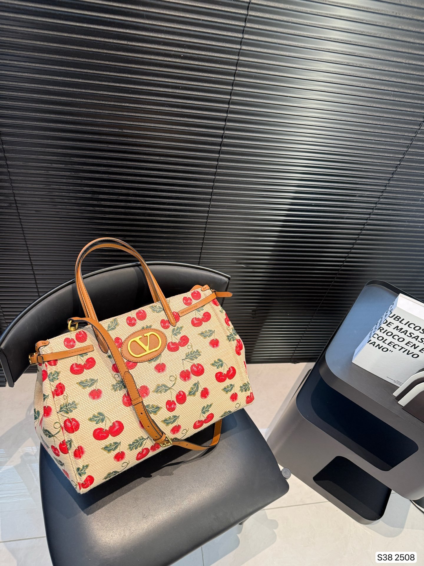 This Valentino cherry-print tote bag features a charming cherry motif on textured fabric, complemented by the iconic V-logo hardware and leather accents, all in a 35×27cm silhouette. Blending whimsical design with luxury craftsmanship, it’s a standout piece for those who love to infuse their style with vibrant, playful details. Perfect for elevating everyday looks or adding a touch of fun to special occasions, this bag embodies Valentino’s ability to merge artistry and sophistication.