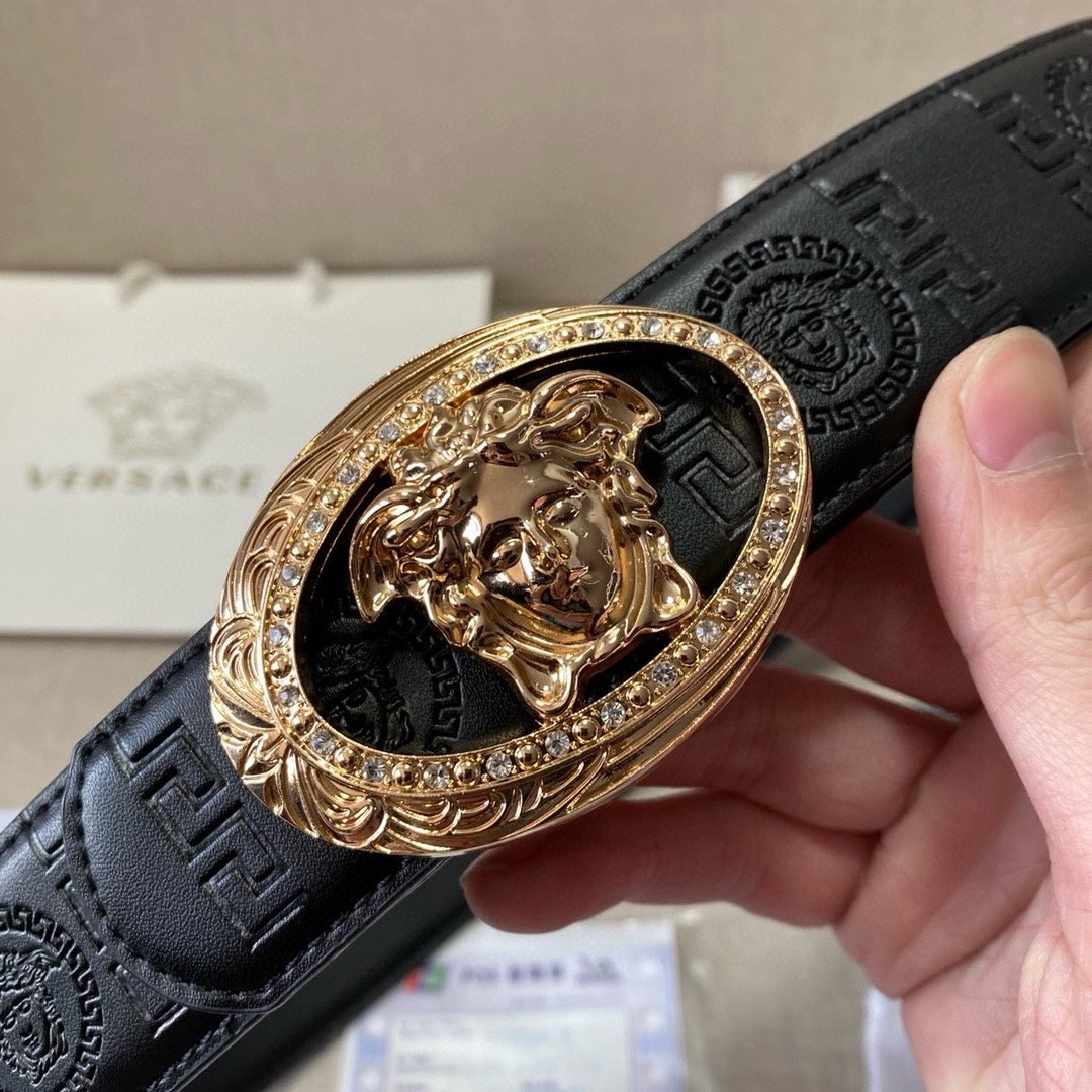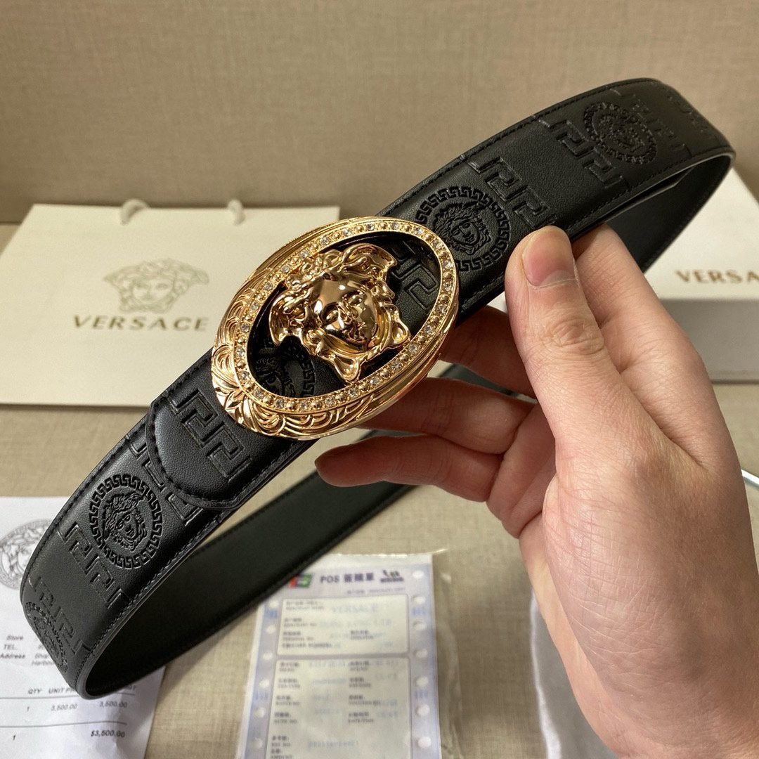 Versace Classic Round Diamond Ring Buckle Black Texture Belt Classic Fashion Noble and Elegant