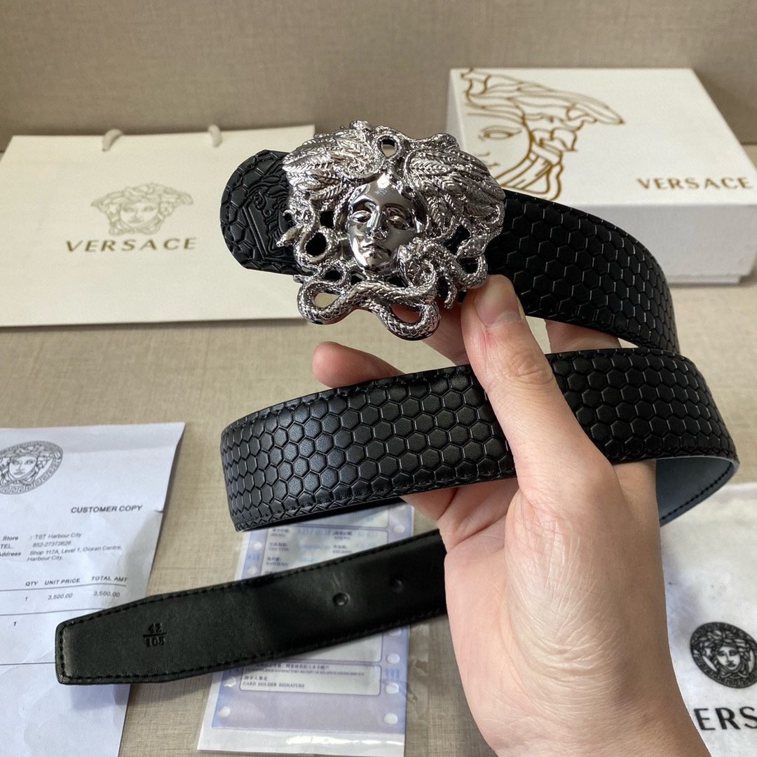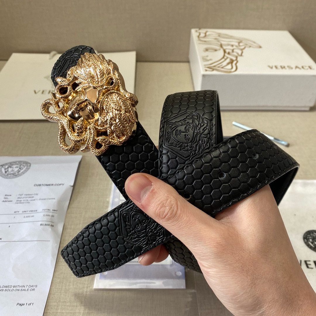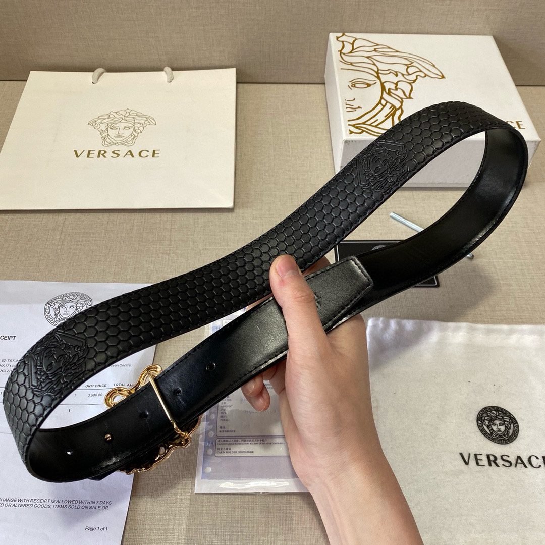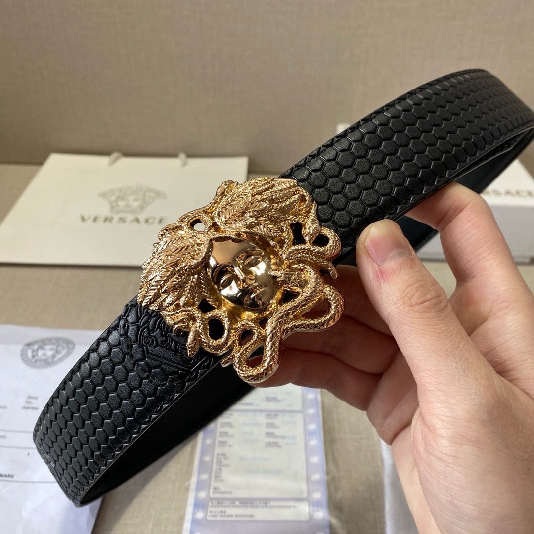 Home Belt VERSACE Belt Versace Classic Medusa Relief Ring Buckle Black Plaid Belt Simple Fashion Noble Elegance