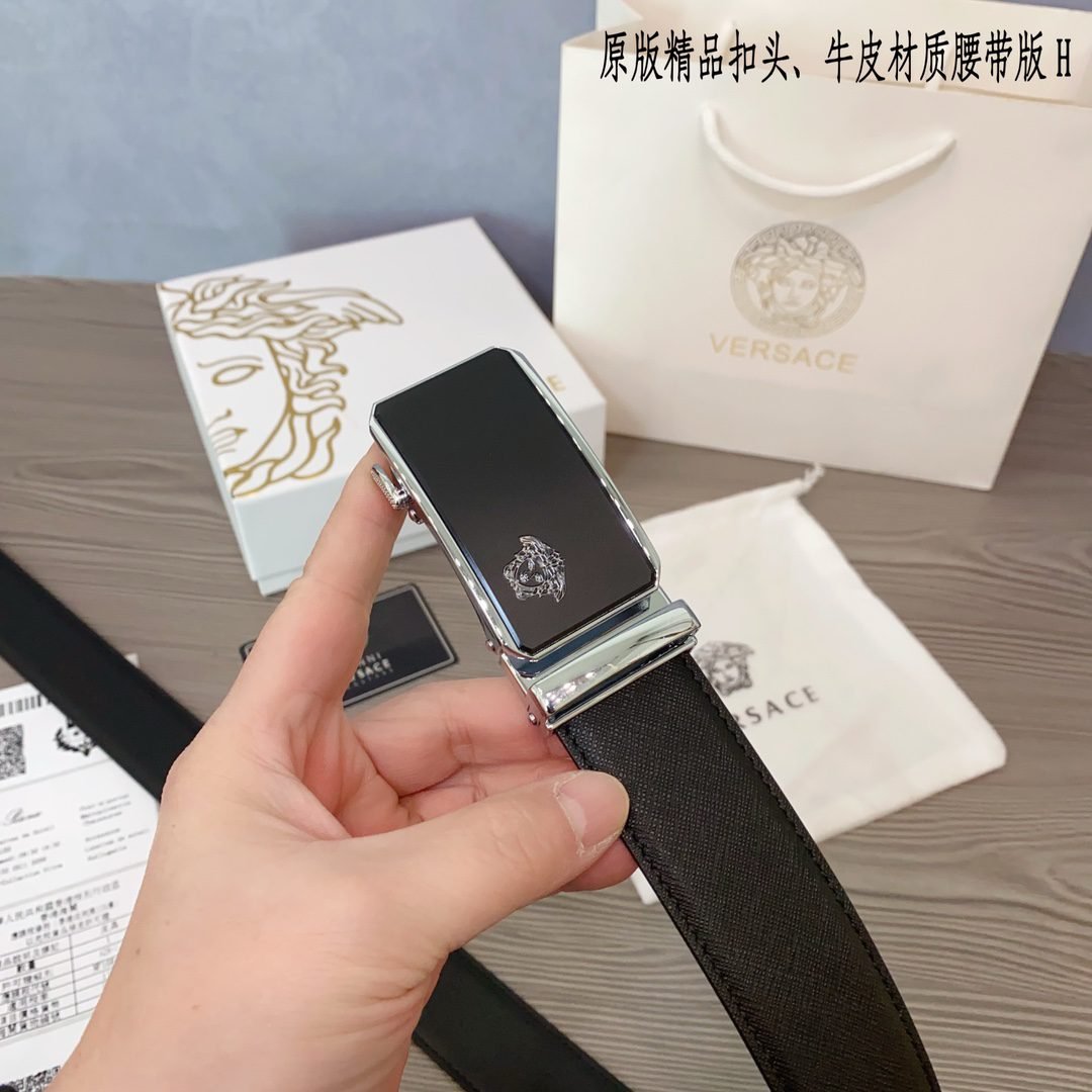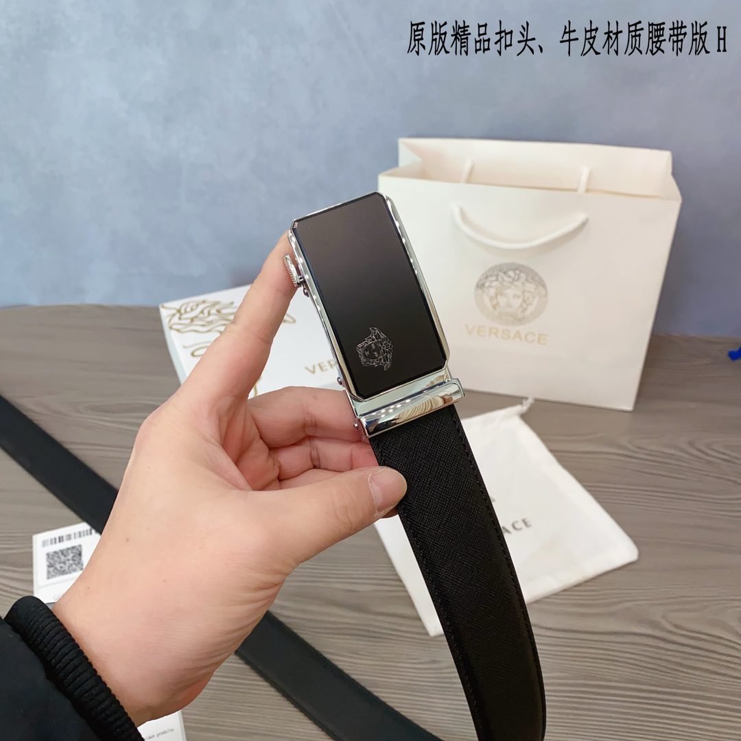 Versace silver square buckle with double-sided black belt, simple, fashionable, noble, and elegant