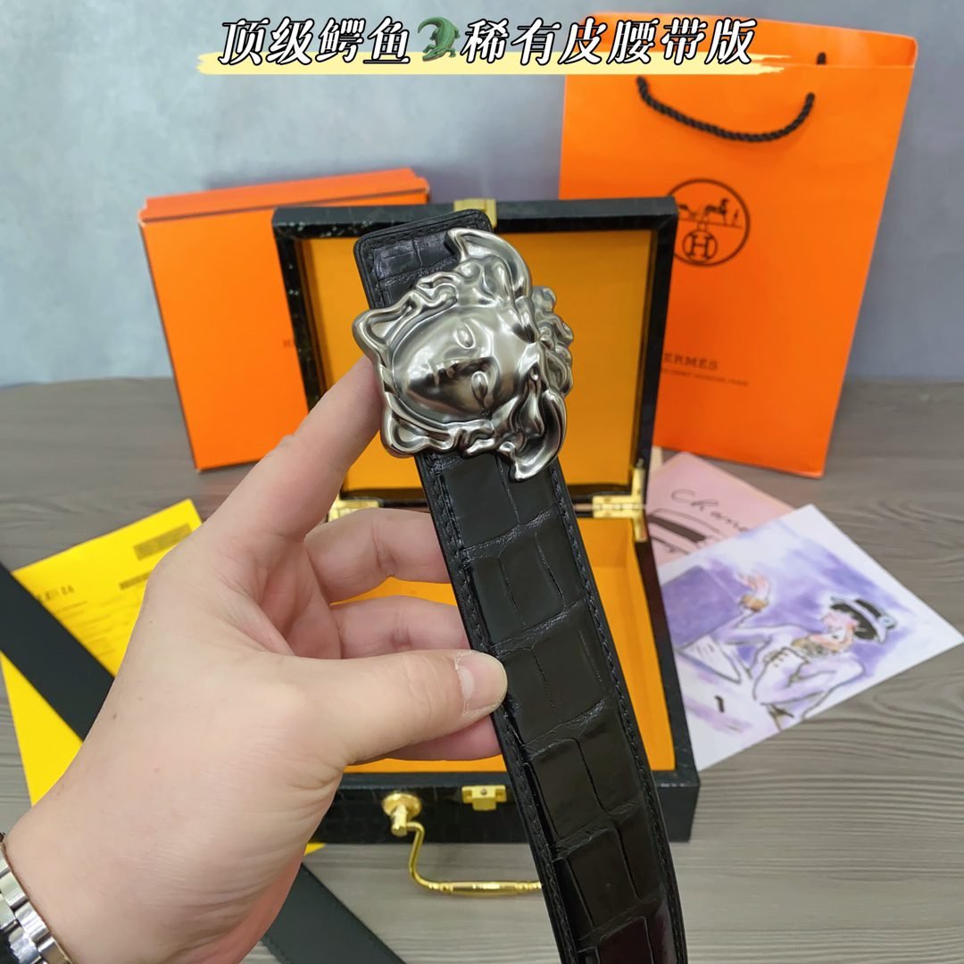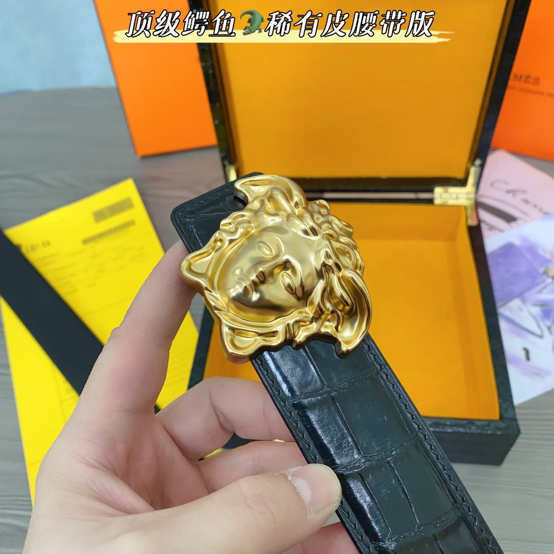 Versace Medusa embossed buckle with black crocodile pattern belt, simple, atmospheric, low-key, luxurious