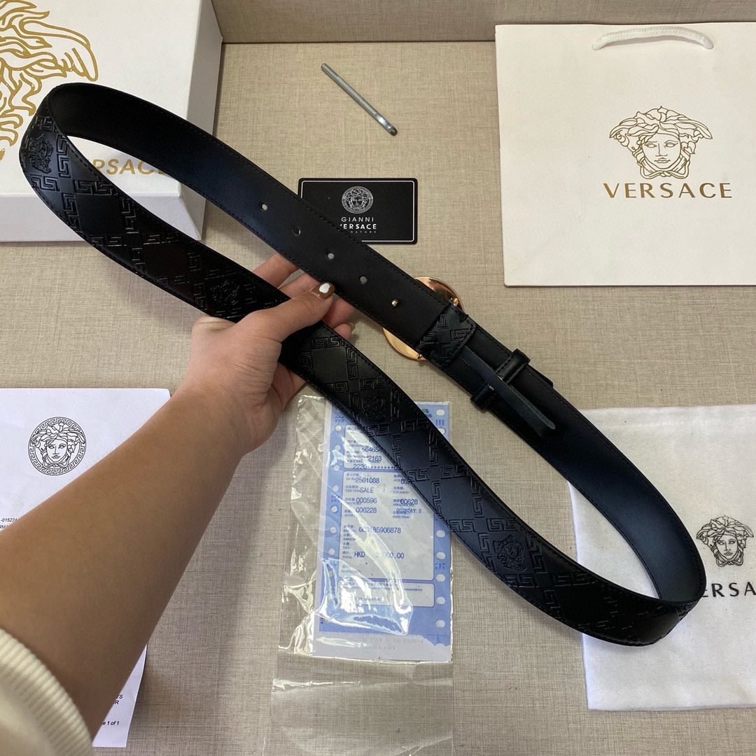 Home Belt VERSACE Belt Versace round buckle black textured belt, simple and elegant, low-key and luxurious