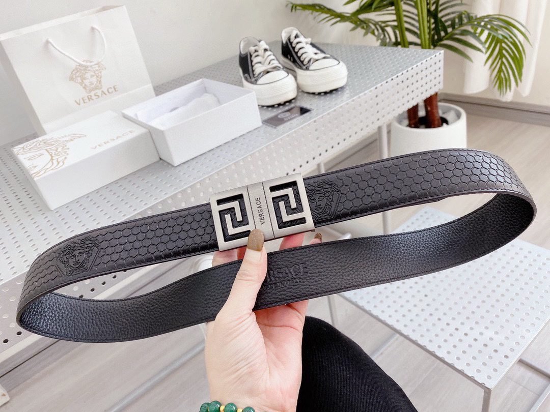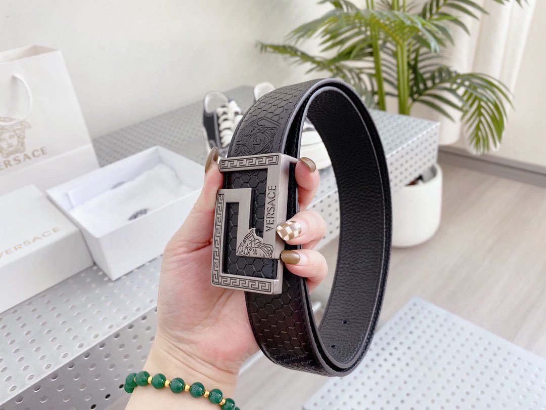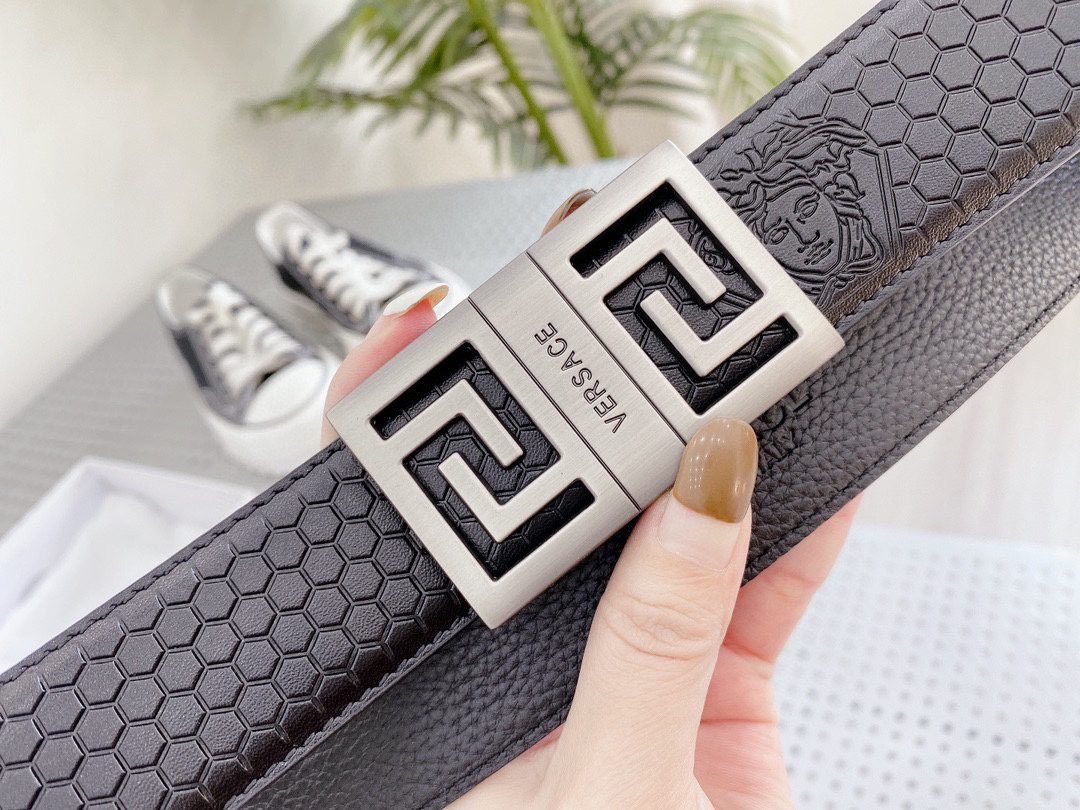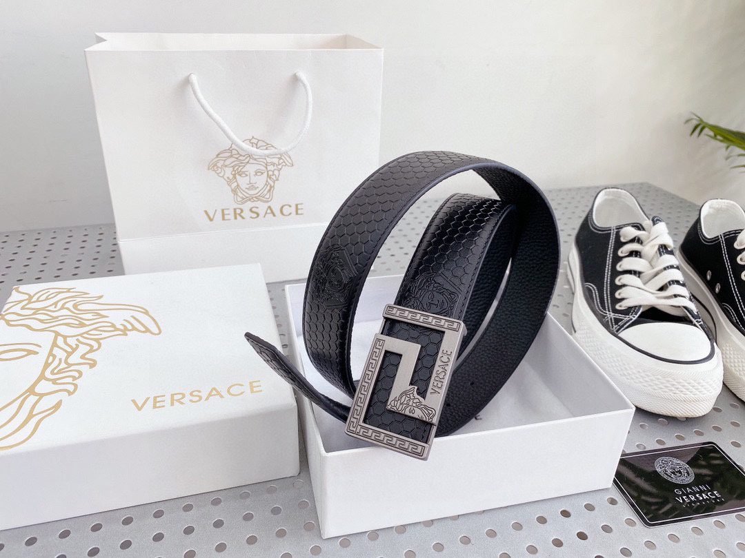 Home Belt VERSACE Belt Versace silver square buckle with black plaid belt, simple and elegant, classic and fashionable