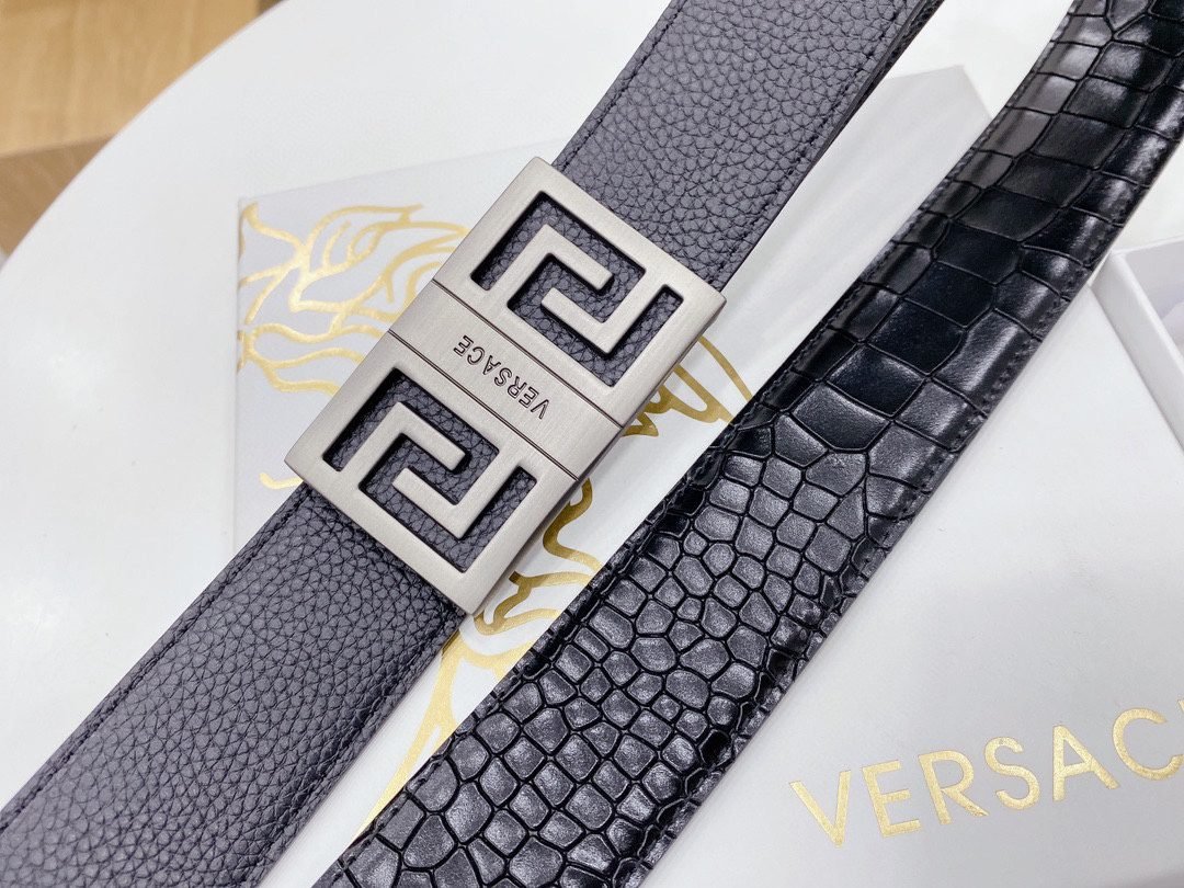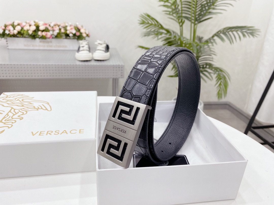 Versace silver square buckle with black texture belt, simple, atmospheric, exquisite and elegant