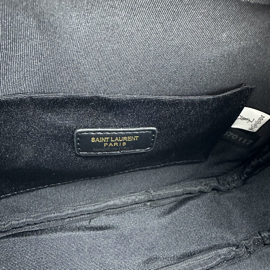 Calfskin forged lining with LAURENT-ENGRAVED metal plaques adorn the zipper. Brush bronze tone metal hardware. Slot pocket shoulder strap vertical: 62 cm